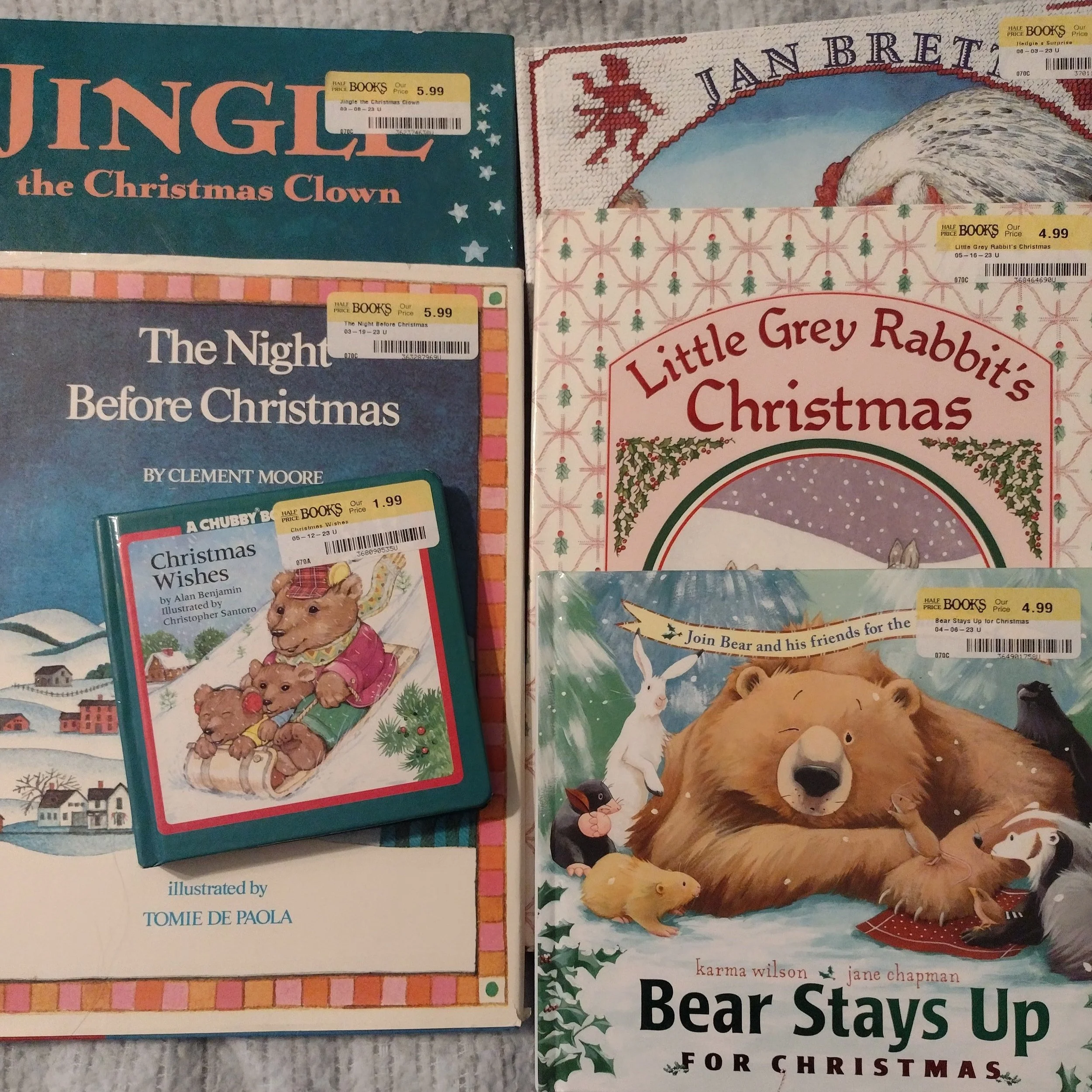All year when I am on the lookout for clothes for the kids at second-hand stores, I’ll peruse their books for both Easter and Christmas. The kids like to go to Half-Price Books for birthday presents so I’ll also look for Christmas books there as well. I have a box in my closet that I keep them in until I’m ready to pick who gets what and see how many more I need to buy. I’ve found some great books that way. One year, I found a beautiful Christmas book written in German for my daughter who is a German major and when I can find Jan Bret or Tommie dePaola books, I feel like I found the pot at the end of the rainbow.